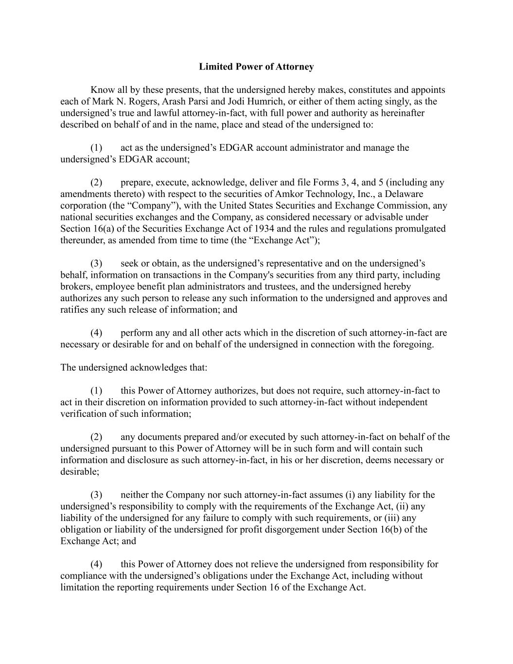Limited Power of Attorney Know all by these presents, that the undersigned hereby makes, constitutes and appoints each of Mark N. Rogers, Arash Parsi and Jodi Humrich, or either of them acting singly, as the undersigned’s true and lawful attorney-in-fact, with full power and authority as hereinafter described on behalf of and in the name, place and stead of the undersigned to: (1) act as the undersigned’s EDGAR account administrator and manage the undersigned’s EDGAR account; (2) prepare, execute, acknowledge, deliver and file Forms 3, 4, and 5 (including any amendments thereto) with respect to the securities of Amkor Technology, Inc., a Delaware corporation (the “Company”), with the United States Securities and Exchange Commission, any national securities exchanges and the Company, as considered necessary or advisable under Section 16(a) of the Securities Exchange Act of 1934 and the rules and regulations promulgated thereunder, as amended from time to time (the “Exchange Act”); (3) seek or obtain, as the undersigned’s representative and on the undersigned’s behalf, information on transactions in the Company's securities from any third party, including brokers, employee benefit plan administrators and trustees, and the undersigned hereby authorizes any such person to release any such information to the undersigned and approves and ratifies any such release of information; and (4) perform any and all other acts which in the discretion of such attorney-in-fact are necessary or desirable for and on behalf of the undersigned in connection with the foregoing. The undersigned acknowledges that: (1) this Power of Attorney authorizes, but does not require, such attorney-in-fact to act in their discretion on information provided to such attorney-in-fact without independent verification of such information; (2) any documents prepared and/or executed by such attorney-in-fact on behalf of the undersigned pursuant to this Power of Attorney will be in such form and will contain such information and disclosure as such attorney-in-fact, in his or her discretion, deems necessary or desirable; (3) neither the Company nor such attorney-in-fact assumes (i) any liability for the undersigned’s responsibility to comply with the requirements of the Exchange Act, (ii) any liability of the undersigned for any failure to comply with such requirements, or (iii) any obligation or liability of the undersigned for profit disgorgement under Section 16(b) of the Exchange Act; and (4) this Power of Attorney does not relieve the undersigned from responsibility for compliance with the undersigned’s obligations under the Exchange Act, including without limitation the reporting requirements under Section 16 of the Exchange Act.