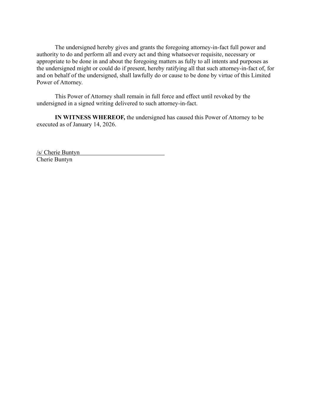 The undersigned hereby gives and grants the foregoing attorney-in-fact full power and authority to do and perform all and every act and thing whatsoever requisite, necessary or appropriate to be done in and about the foregoing matters as fully to all intents and purposes as the undersigned might or could do if present, hereby ratifying all that such attorney-in-fact of, for and on behalf of the undersigned, shall lawfully do or cause to be done by virtue of this Limited Power of Attorney. This Power of Attorney shall remain in full force and effect until revoked by the undersigned in a signed writing delivered to such attorney-in-fact. IN WITNESS WHEREOF, the undersigned has caused this Power of Attorney to be executed as of January 14, 2026. /s/ Cherie Buntyn Cherie Buntyn